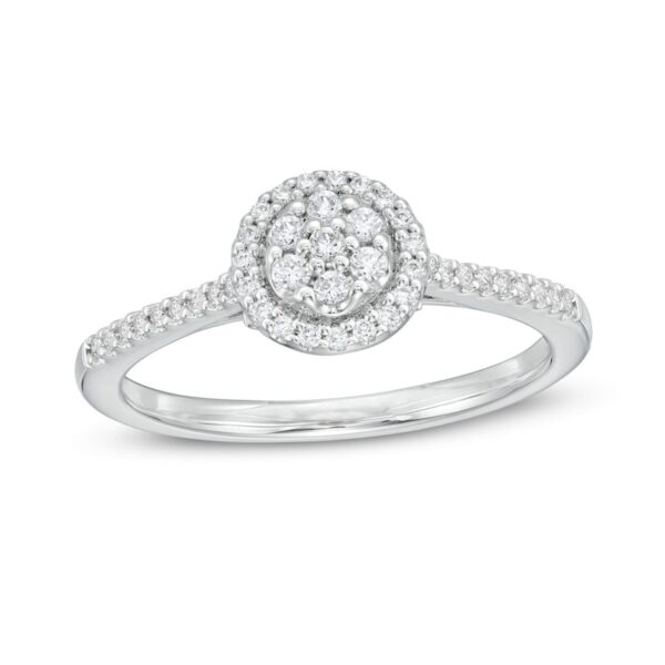 This classic style is crafted in 10K white gold, with a diamond composite that sparkles in a halo of diamonds. This ring is stunning with 1/4 carat diamonds and brilliant polish.