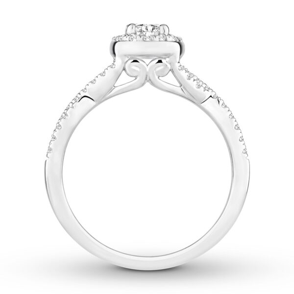 This stunning engagement ring effortlessly combines romantic and modern styles for a design they will love. Round diamonds halo a sparkling diamond in the center, while graceful twists of diamonds form the band. The 14K white gold ring has a total diamond weight of 5/8 carat.