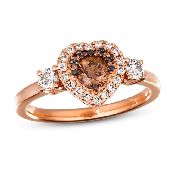This ring is available in limited sizes. If you don’t see your size here, please visit a store to order your ring. From his stunning diamond ring for her is crafted in delicious 14K Strawberry Gold. The decadent band is embellished with a heart-shaped center that is drizzled in Nude Diamonds along its halo. Rich, luscious round Chocolate Diamonds sit poised in the center of the heart, while more sweet round Nude Diamonds hug the center of the ring for a total diamond weight of 5/8 carat.