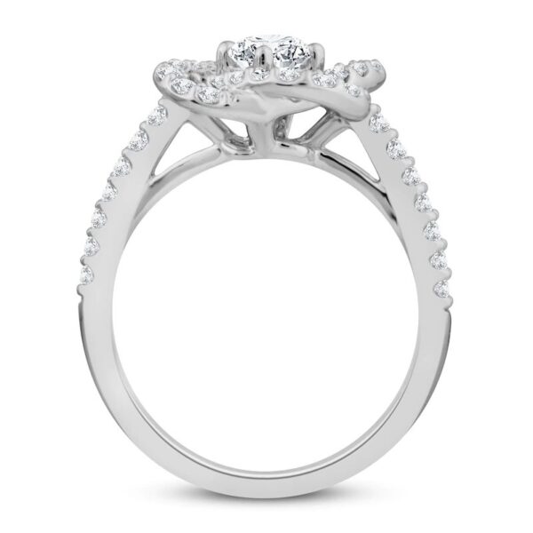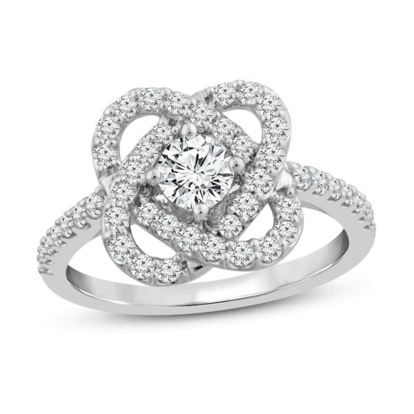 This eye-catching diamond ring features a unique interwoven design to symbolize the strength of love and keeping you centered. Crafted of 14K white gold, the ring features a beautiful round center diamond and dazzles with round diamonds throughout, bringing its total diamond weight to 1 carat.